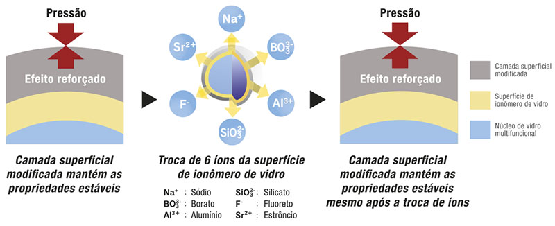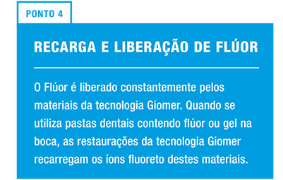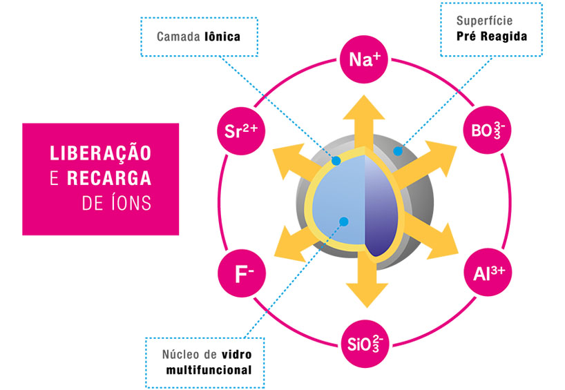 Muito mais do que um simples material Biocompatível, ou ação isolada de liberação de flúor, os materiais da família GIOMER possuem como característica principal a liberação de SEIS tipos de íons, cada qual com a sua propriedade Bioativa: BO33−(Borato), Al+3 (Alumínio), Na+ (Sódio), F- (Fluoreto), Sr+2 (Estrôncio), SiO3-2 (Silicato) e recarga.