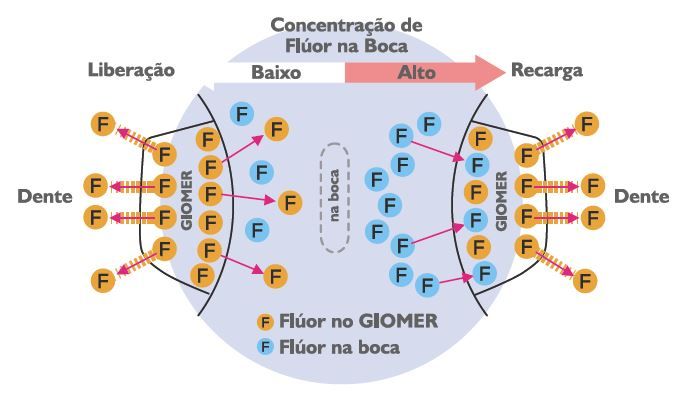 Essas partículas S-PRG liberam e recarregam o flúor no GIOMER. O flúor contido no GIOMER é capaz de: