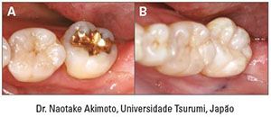 A. Imagem pré-operatória de inlay de ouro necessitando ser substituído.